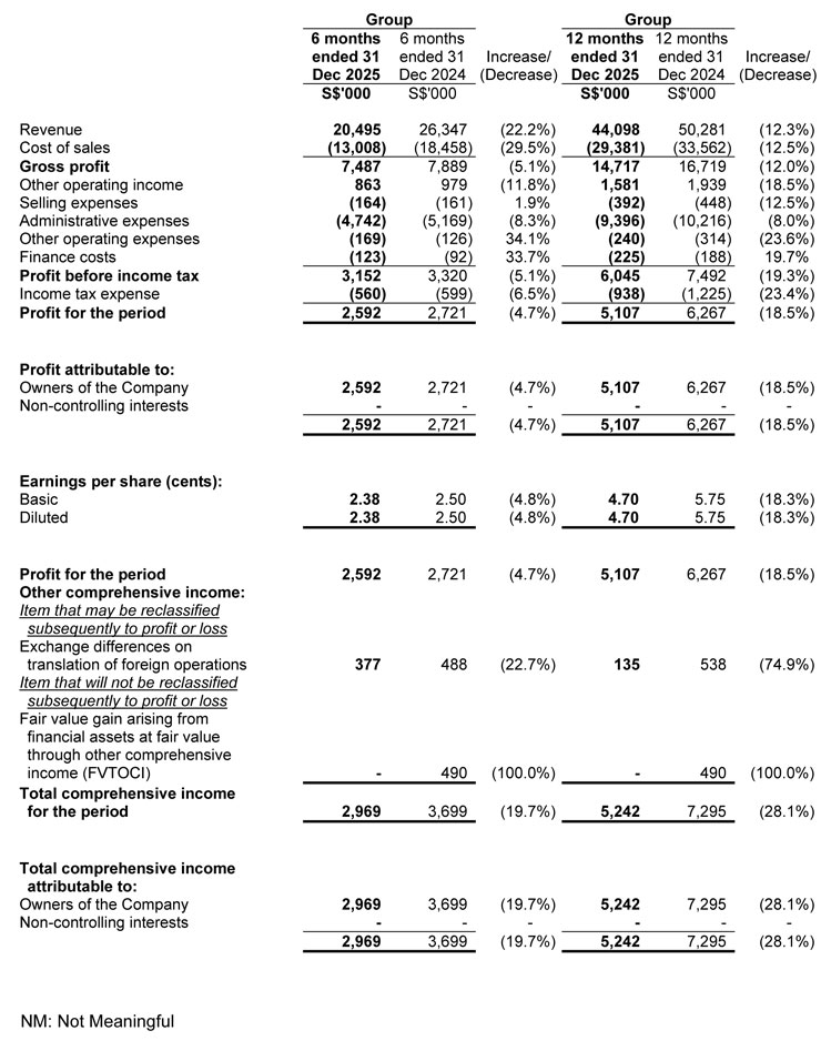 The Group registered a total revenue of S$20.5 million in 2H FY2025, which was 22.2% lower than 2H FY2024. Total revenue of S$44.1 million for 12M FY2025 was 12.3% lower as compared to 12M FY2024. The decrease was mainly due to lower revenue generated from Trading business.