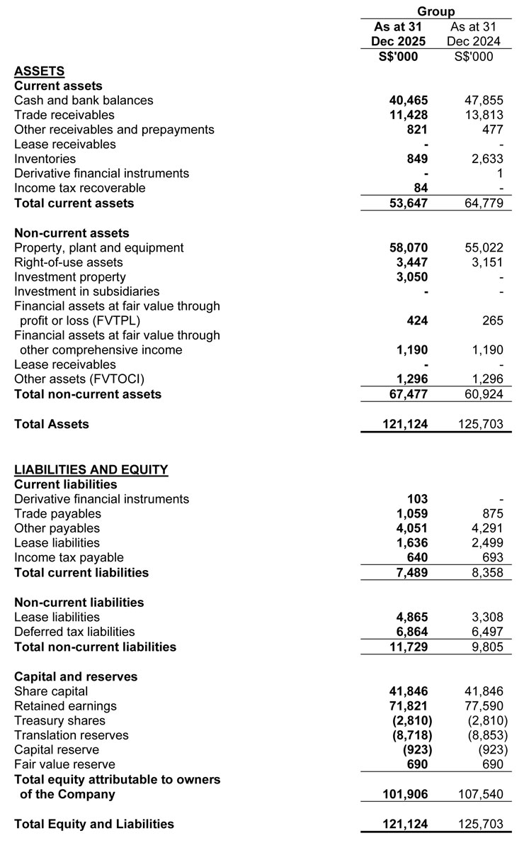 As at 31 December 2025, the Group's total equity stood at S$101.9 million. Total equity decreased by S$5.6 million as compared to 31 December 2024, mainly due to dividend payment, which was partially offset by profit for the year.