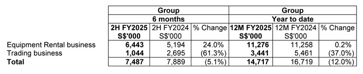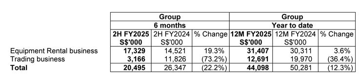 Revenue from Equipment Rental business increased by 19.3% to S$17.3 million in 2H FY2025 and increased by 3.6% to S$31.4 million in 12M FY2025 as compared to the corresponding periods in FY2024 respectively. The increase was mainly due to the increased level of activities in Singapore's operations.